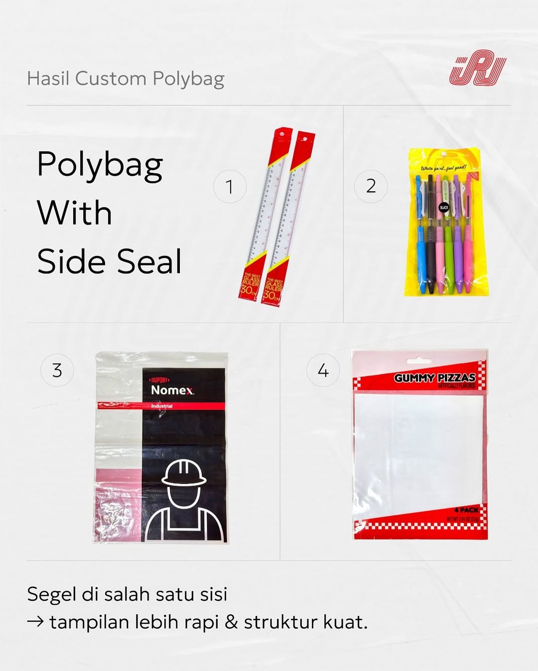 Polybag with side seal adalah jenis kantong plastik yang disegel di kedua sisi sampingnya, sementara bagian bawah dan atasnya tetap terbuka untuk pengisian dan penyegelan akhir. Struktur ini menjadikan polybag tipe ini sangat sederhana, efisien, serta cocok untuk proses pengemasan otomatis maupun manual.
